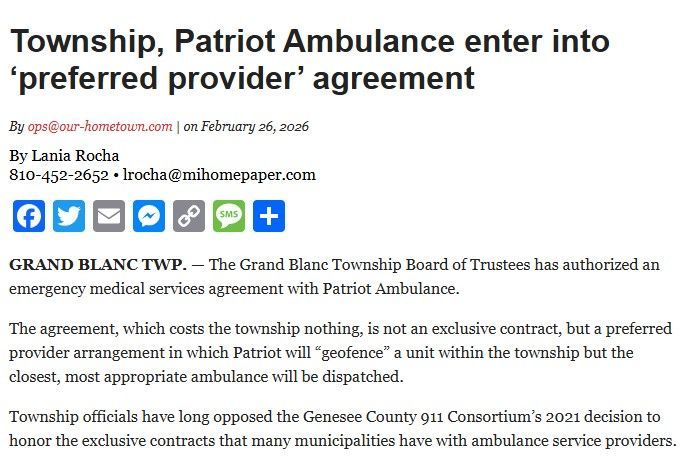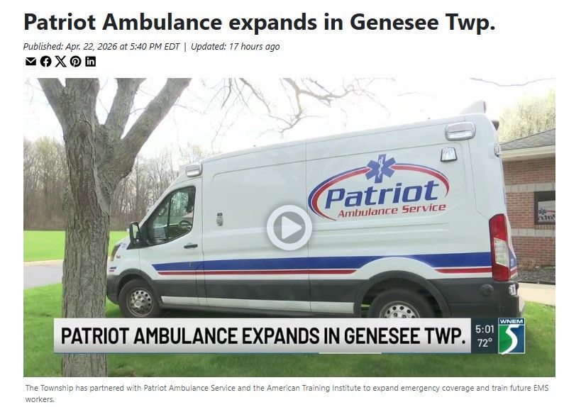 WNEM TV5 • April 22, 2026 GENESEE TWP., Mich. (WNEM) – A new partnership will bring local emergency crews closer to home and cut down response times. In Genesee Township, help is now closer than ever for calls where every second matters. “They’ll be geofenced in Genesee Township to help our residents at a dime’s call,” said Daniel Eashoo, Genesee Township supervisor. The Township has partnered with Patriot Ambulance Service and the American Training Institute to expand emergency coverage and train future EMS workers.